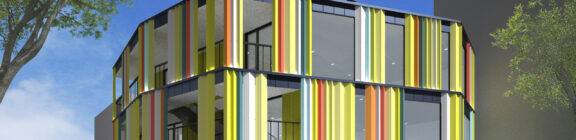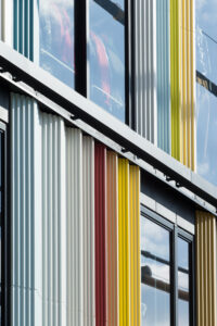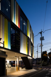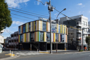 世田谷の空や街並みに溶け込むパステルカラーを基調としながら、ピロティ形式とすることで都市空間に開放感と軽やかさをもたらしている。