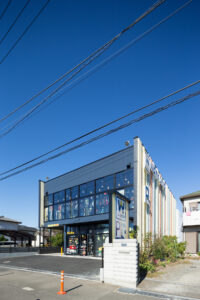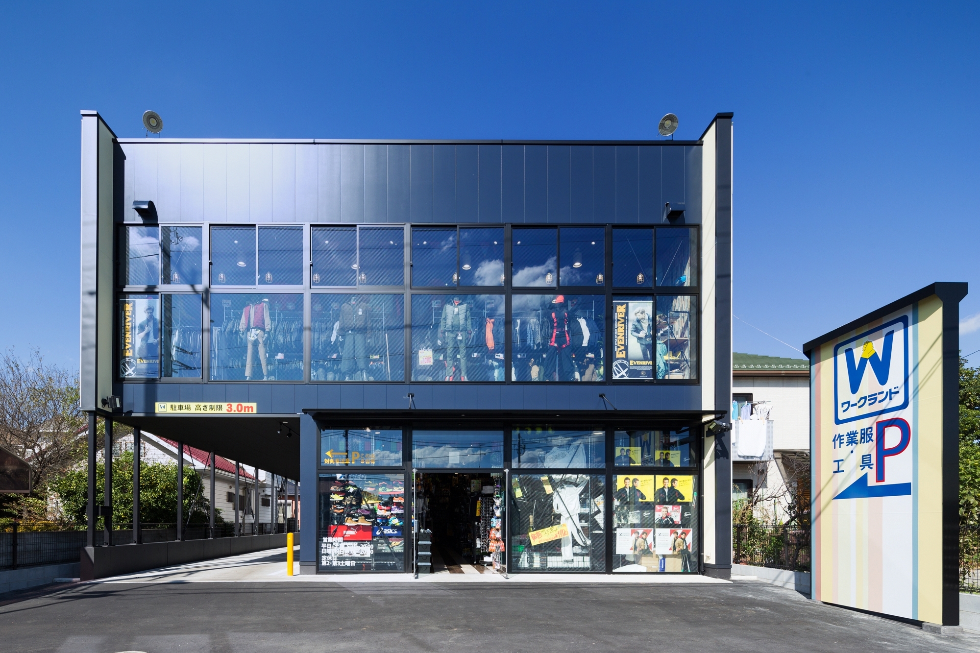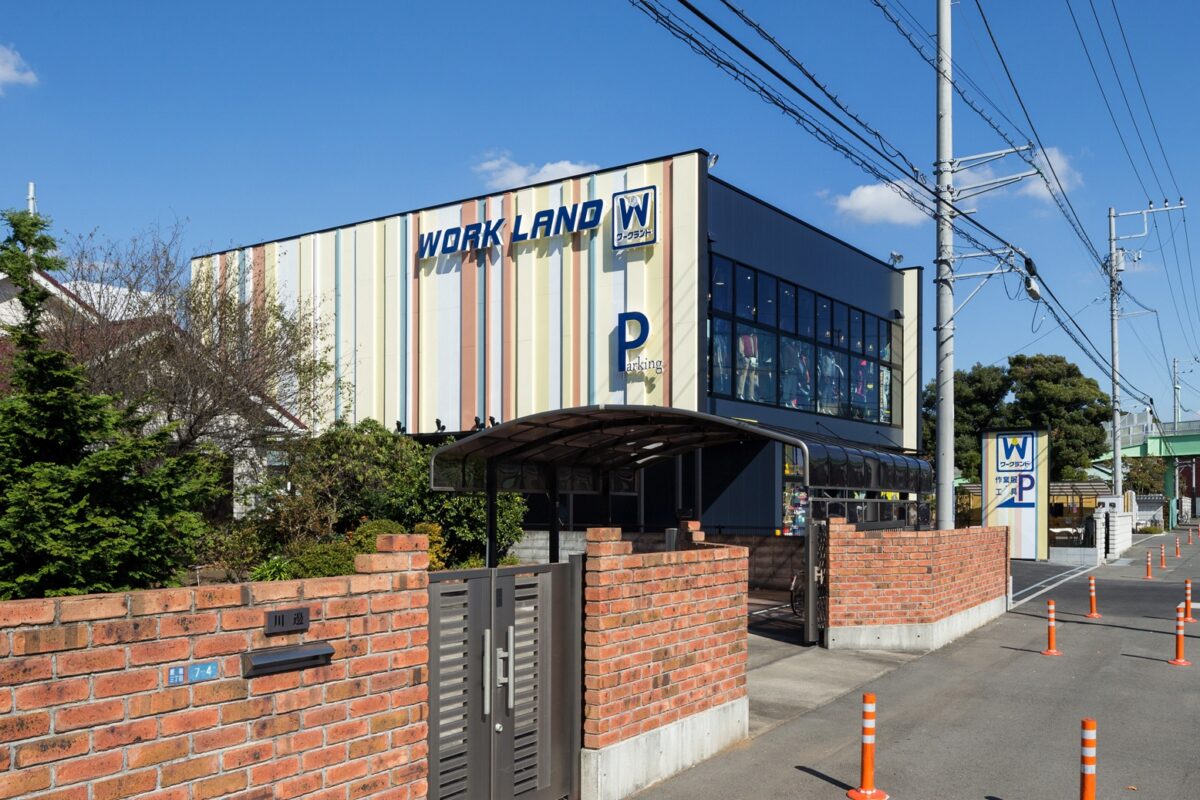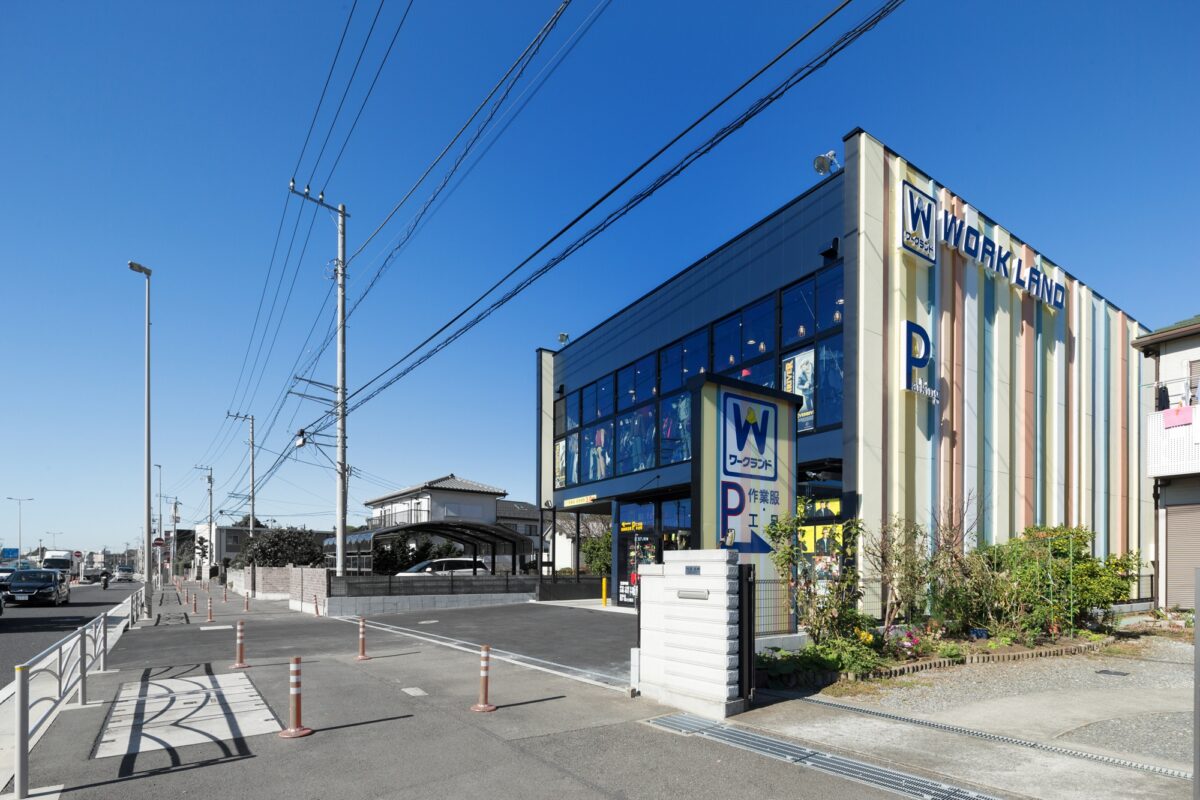 ワークランド横浜原宿店は、倉庫仕様をベースとした合理的な構成により、外壁を含む建築コストを抑えながら、ロードサイド型店舗として求められる視認性とデザイン性を両立させたプロジェクトである。仕上げや構法を簡素化しつつも、外観デザインの工夫によって、単なる倉庫的建築にとどまらない表情づくりを試みている。
