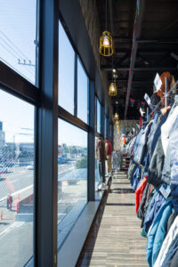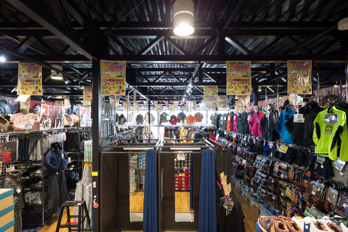 ロードサイド型店舗の中でも特に「存在感と調和」を両立させた外観構成が特徴であり、建物正面には縦リブ状のパネルをランダムピッチで配置。淡いベージュ、ミントグリーン、テラコッタなどのパステルトーンを組み合わせることで、工業的でありながらも温かみのある印象を与えている。カラーリングは、「働く服」を扱う店舗としての堅実さと、地域に開かれた柔らかさを同時に表現するものとして計画した。