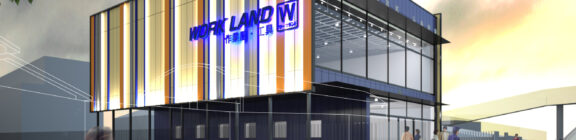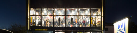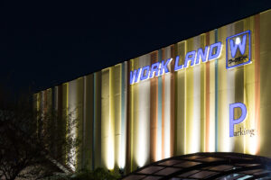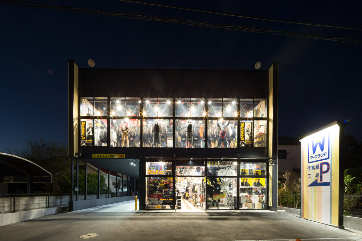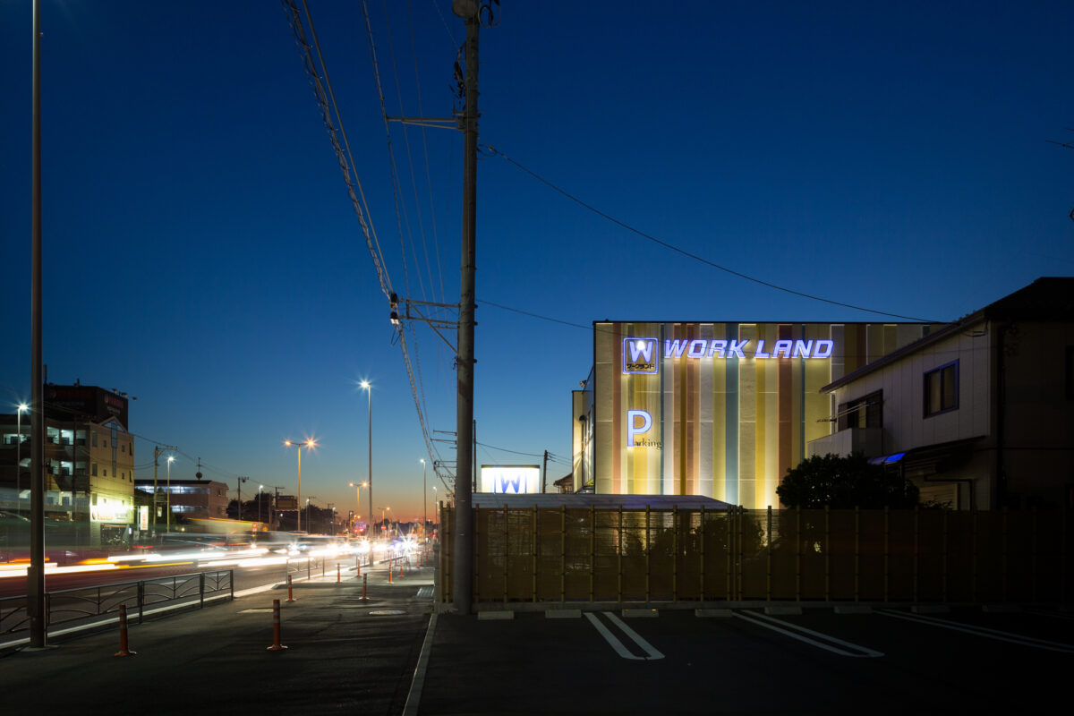 「WORKLAND」のサインは、建物全体の光の構成の中に溶け込ませ、過度な主張を避けながらもブランドの存在を自然に印象づけている。全体として、構成要素はシンプルでありながら、カラー、光、立体的なリズムによって豊かな表情を生み出し、商業建築におけるデザイン的品位とコストバランスの両立を意図した建築である。
