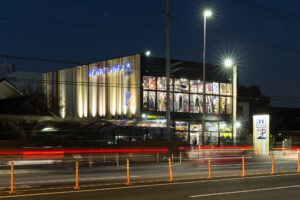 夜間の照明演出では、縦リブの陰影を強調するウォールウォッシャー照明を効果的に用い、昼間とは異なるリズムをファサードに与えている。照明の色温度を統一しつつ、パネルの凹凸に沿って光を拡散させることで、立体的な陰影と素材の質感が際立つ構成とした。